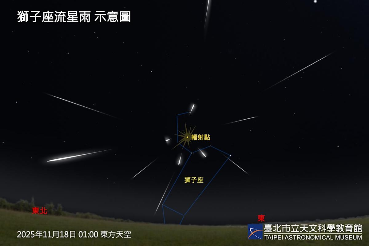 De Taipei City Astronomical Museum heeft vandaag aangekondigd dat de Leeuwen-Meteorenzwerm aanstaande maandag (17e) een piek zal bereiken. Naar verwachting zullen er ongeveer 15 meteoren per uur te zien zijn. Dankzij de maanfase van de afnemende maan, die weinig verstoring zal veroorzaken, is het een uitstekende gelegenheid om de meteoren te observeren. Het publiek wordt aangemoedigd om na 23:30 uur naar een plek zonder lichtvervuiling te gaan en in het noord-oosten te kijken.