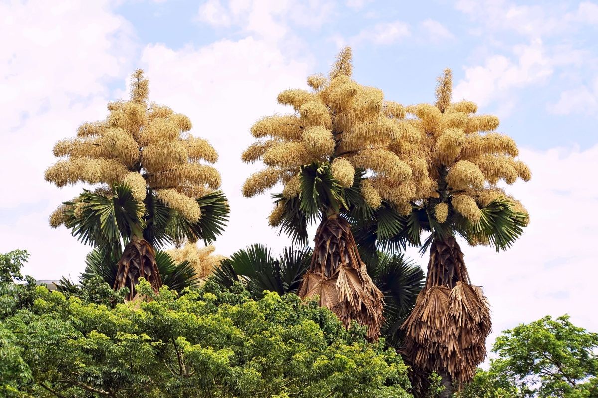 Deze unieke soort, afkomstig uit India en Sri Lanka en wetenschappelijk bekend als Corypha umbraculifera, groeit tot 30 meter hoog en produceert een van de grootste bloeiwijzen ter wereld. Deze palmbomen bloeien echter pas kort voordat ze sterven. Ze hebben een levensduur van ongeveer 60 jaar voordat ze bloesems en vruchten produceren, waarop hun leven ten einde komt.